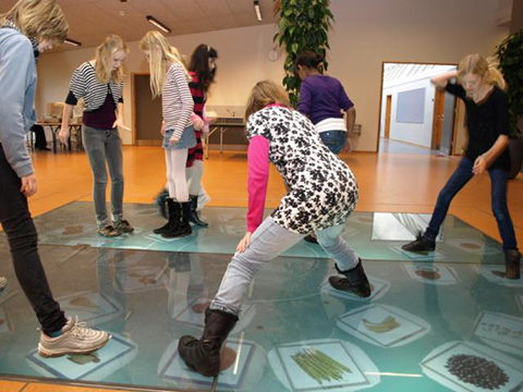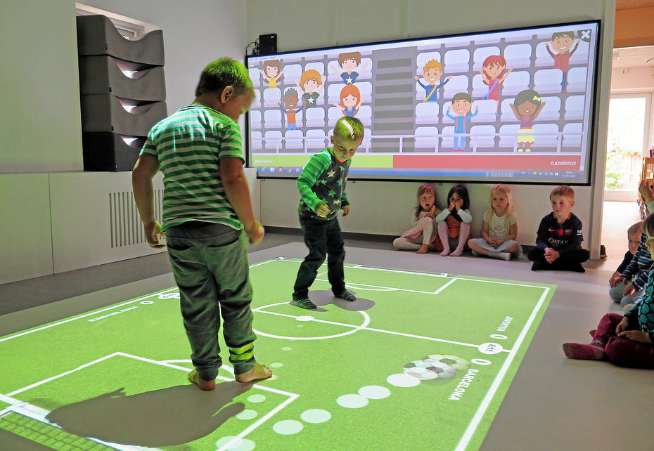 Børn bruger kroppen i digitalt universSN rapporterer fra Gilbjerg Børnehuse, der som de første i verden har fået en tilhørende væg til deres interaktive gulv WizeFloor. Der er bl.a. digitale tilskuere, der reagerer på fodboldkampens resultat og blomster, der vokser op i takt med børnenes bevægelser på gulvet. Læs hele artiklen her. Foto: Camilla Nissen